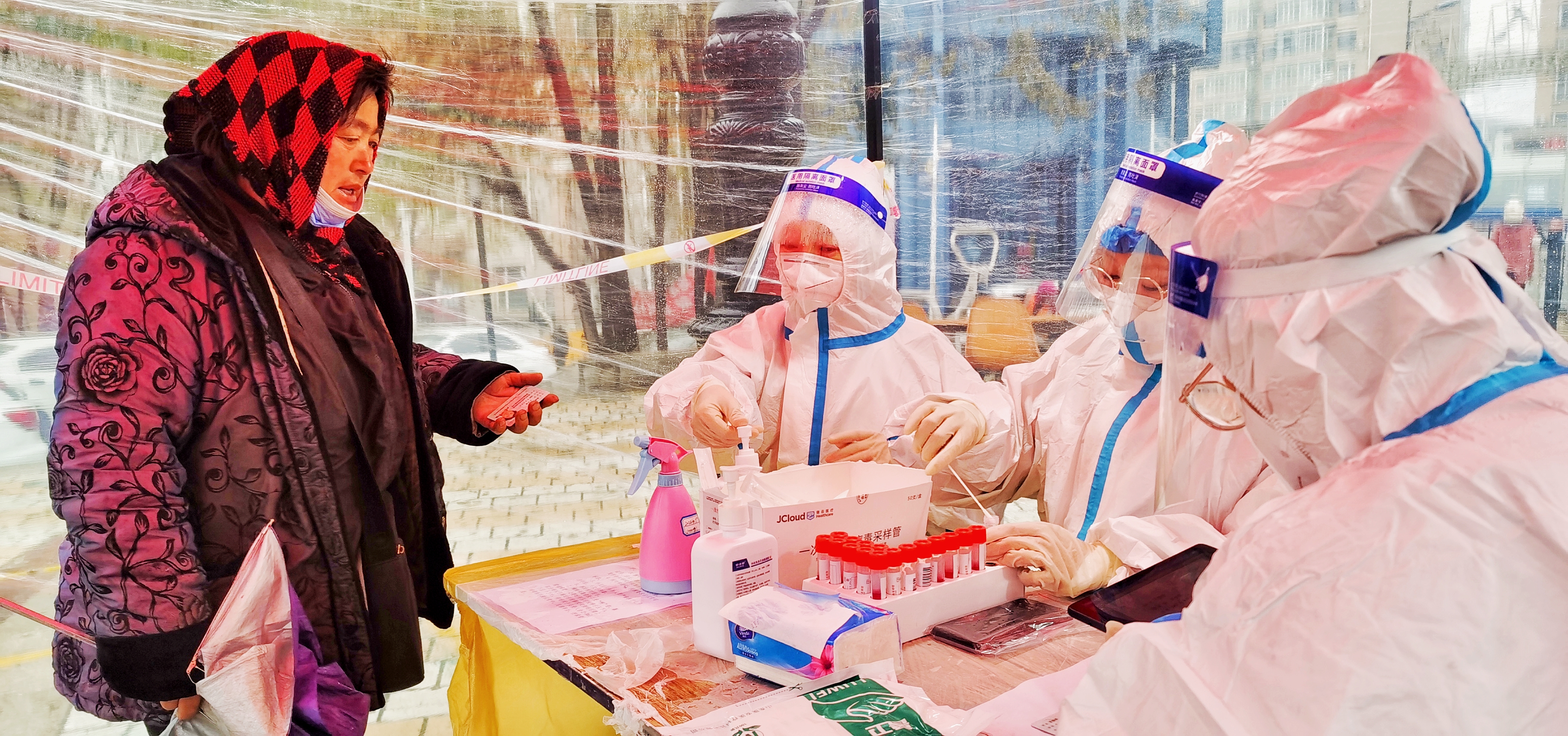 哈爾濱市第一人民醫(yī)院的醫(yī)護(hù)人員在核酸檢測取樣