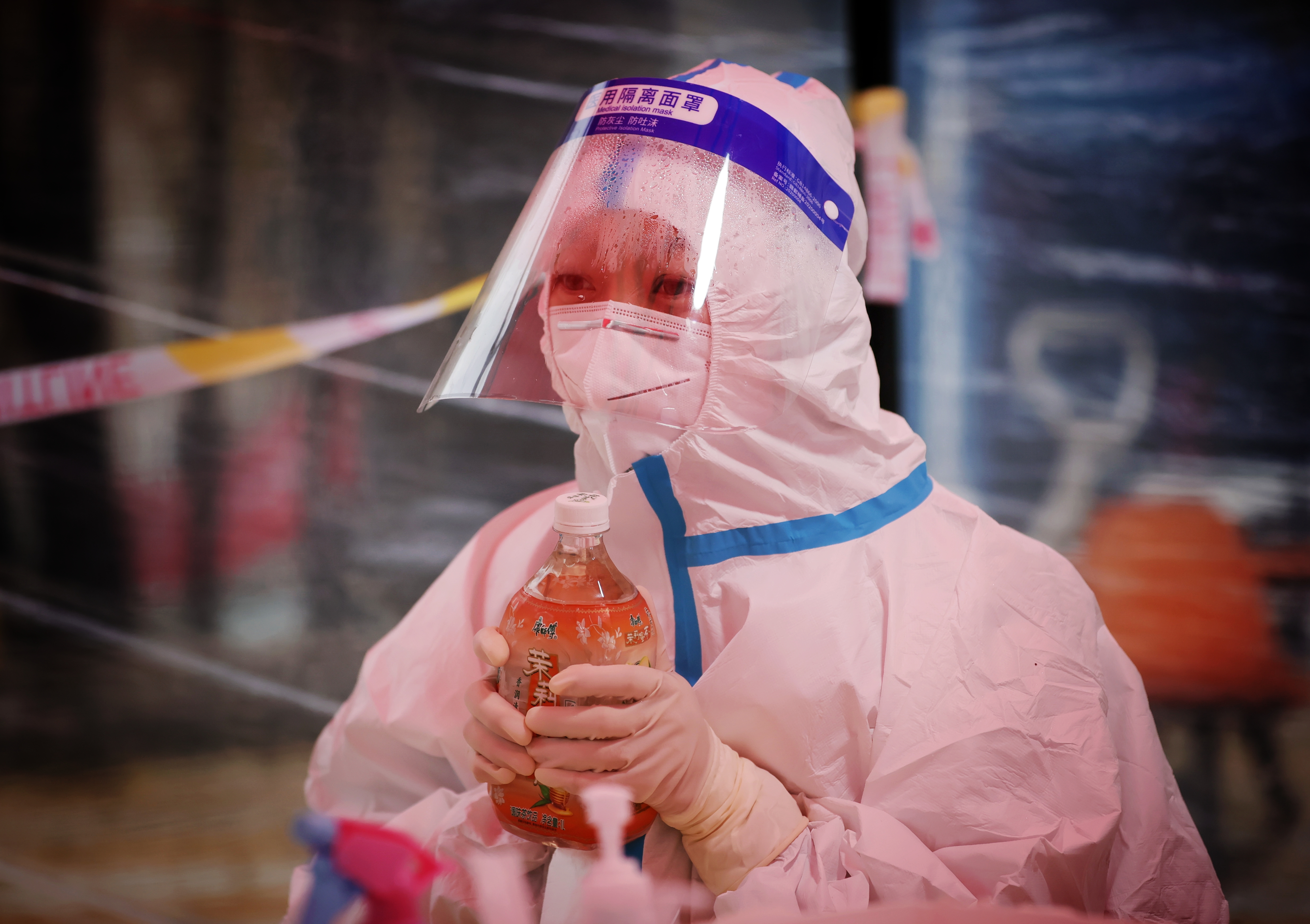醫(yī)護(hù)人員用裝熱水的飲料瓶溫暖一下雙手